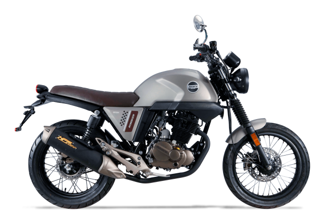 La Ronsker toma como base para su diseño las clásicas motos de los años setenta, combinando líneas afiladas, un moderno tablero digital, tapas con acabados que simulan fibra de carbono y un escape de última generación, que le permite alcanzar la certificación Euro.